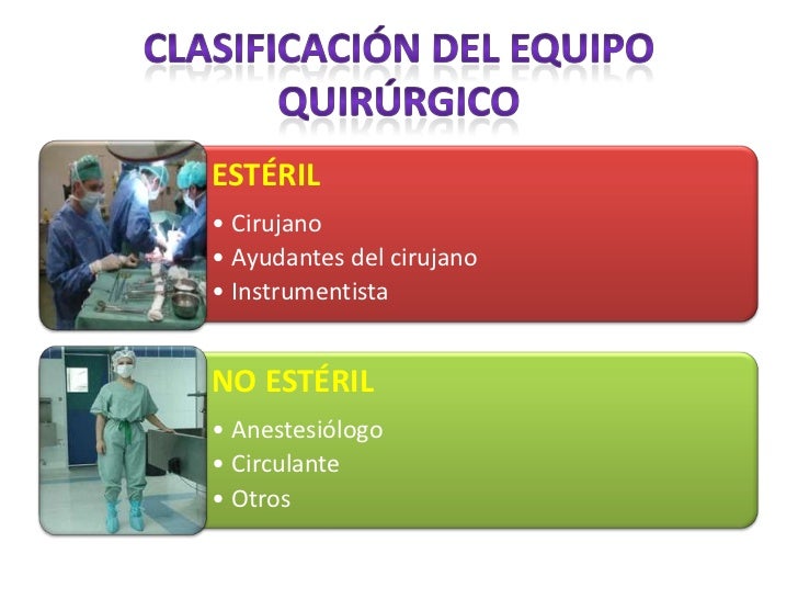 Cirujano: líder del equipo quirúrgico. Él o ella es en última instancia responsable de realizar la cirugía de manera eficaz y segura; sin embargo, depende de otros miembros del equipo para el bienestar emocional y el control fisiológico del paciente.